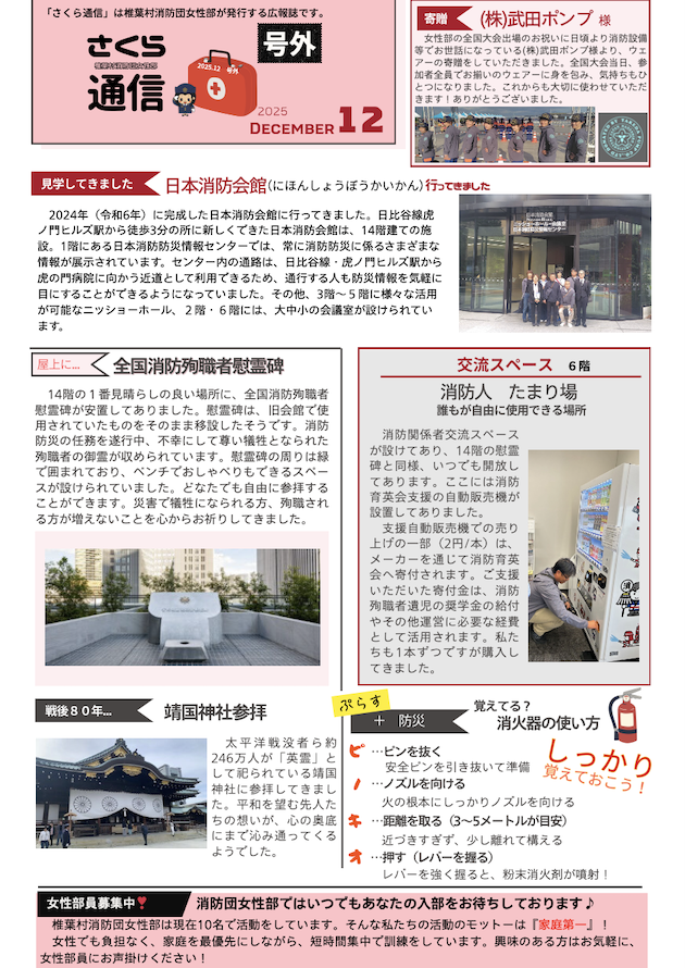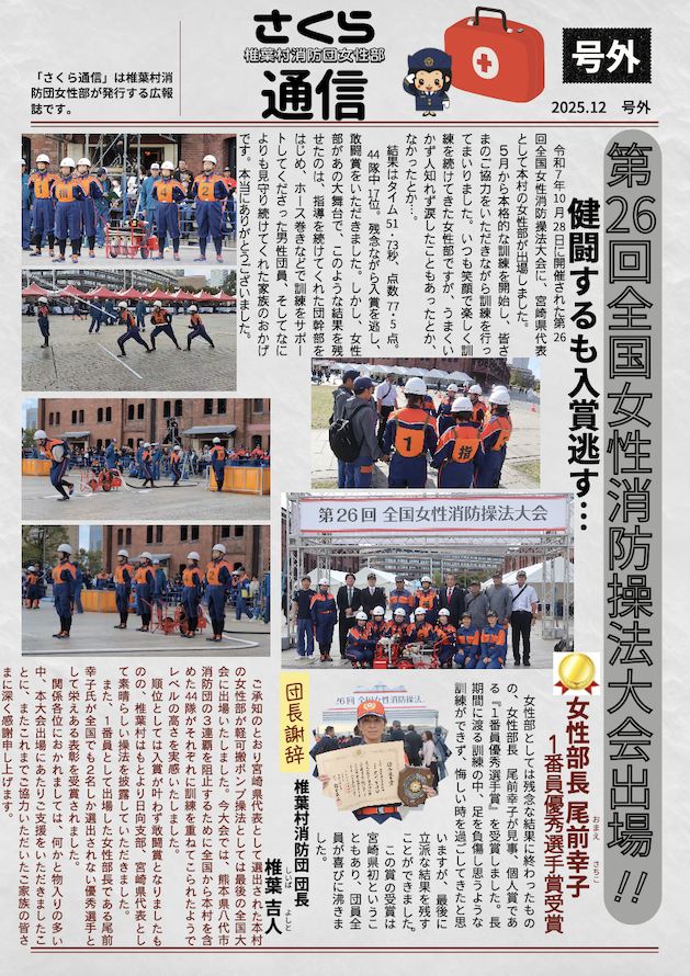 椎葉村消防団女性部では、多くの村民の皆さまに消防団活動を知っていただくため、 年に2回さくら通信を発行し、村内全世帯に配布しております。 …が、今回は『号外』です!! 令和7年10月28日に『第26回全国女性消防操法大会』に出場した 結果報告とお礼が掲載されております。 ぜひ、ご覧ください♪