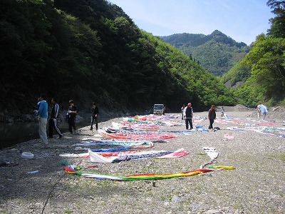 広げた後は、あらかじめ引っ張ってきておいたワイヤーに鯉のぼりを固定する作業です。シノをワイヤーに通して、鯉のぼりを結ぶヒモをとおします。これがナカナカ難しいんです(^_^;)