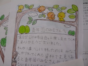 「この間の集合学習はどうもありがとうございました。私は青年団の事をあまり知らなかったけど、この間来て下さったおかげで、青年団が何をやっているのかよく知りました。」
